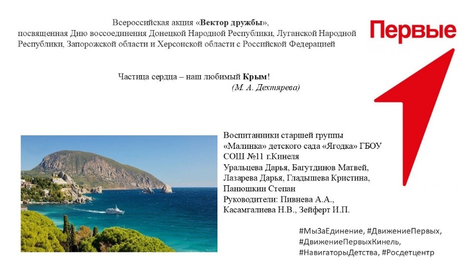 В рамках всероссийской акции «Вектор дружбы», посвященная Дню воссоединения Донецкой Народной Республики, Луганской Народной Республики, Запорожской области и Херсонской области с Российской Федерацией (Сроки проведения: с 24 по 30 сентября 2025 года.) педагоги детского сада «Ягодка» провели с детьми старшего дошкольного возраста ряд занятий по раскрытию данной темы, по окончании которых дети в составе: Уральцевой Дарьи, Багутдинова Матвея, Лазаревой Дарьи, Гладышевой Кристины, Панюшкина Степана (ст.гр.»Малинка») разучили и рассказали стихотворение М. А. Дехтяревой «Частица сердца – наш любимый Крым!».